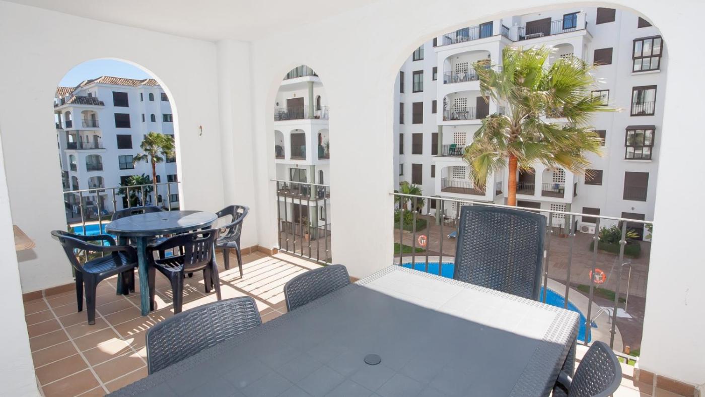 The spacious apartment is fitted with 2 bedrooms, 2 bathrooms, bed linen, towels, a TV with satellite channels, a fully equipped kitchen, and a balcony with sea views. The property offers pool views.